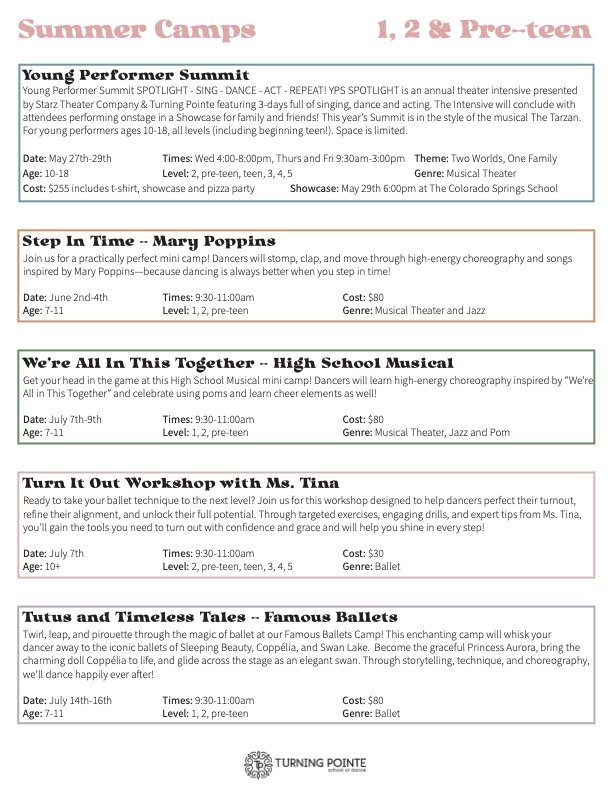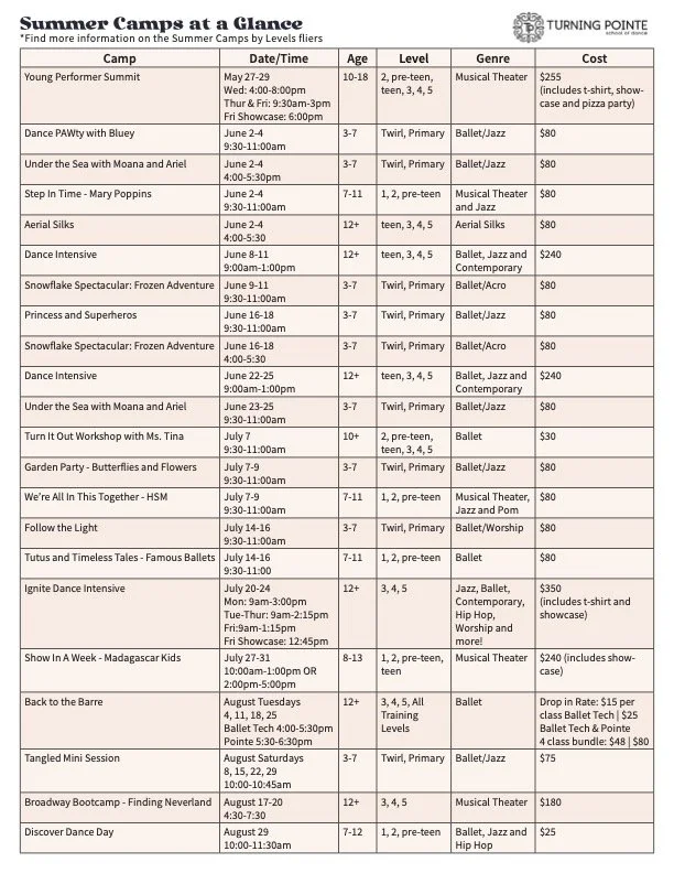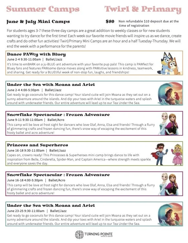 A student wishing to drop a camp or classes they are registered for is considered to be withdrawing. A student not showing up does not constitute a withdrawal. To withdraw from a class, written notice must be sent to our school administrator at info@turningpointeschoolofdance.com before the 20th of the previous month (May 20th for summer classes) or you will continue to be responsible for full tuition payment.