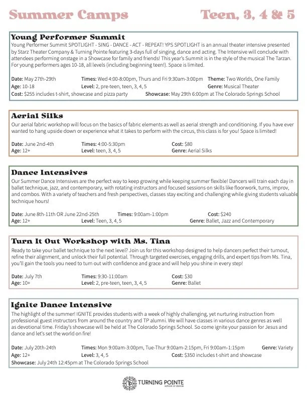 Summer can be a great time to focus on dance – there are fewer distractions, less homework and no recital choreography to remember. Refine your focus and set some summer goals. Want to master that pirouette? How about getting all the way down in those left splits? Even if it's as simple as building strength in your ankles or improving your turnout, summer is the perfect time to work toward those milestones. At Turning Pointe, we promote safety through ongoing training, cross training, and intentional periods of rest.