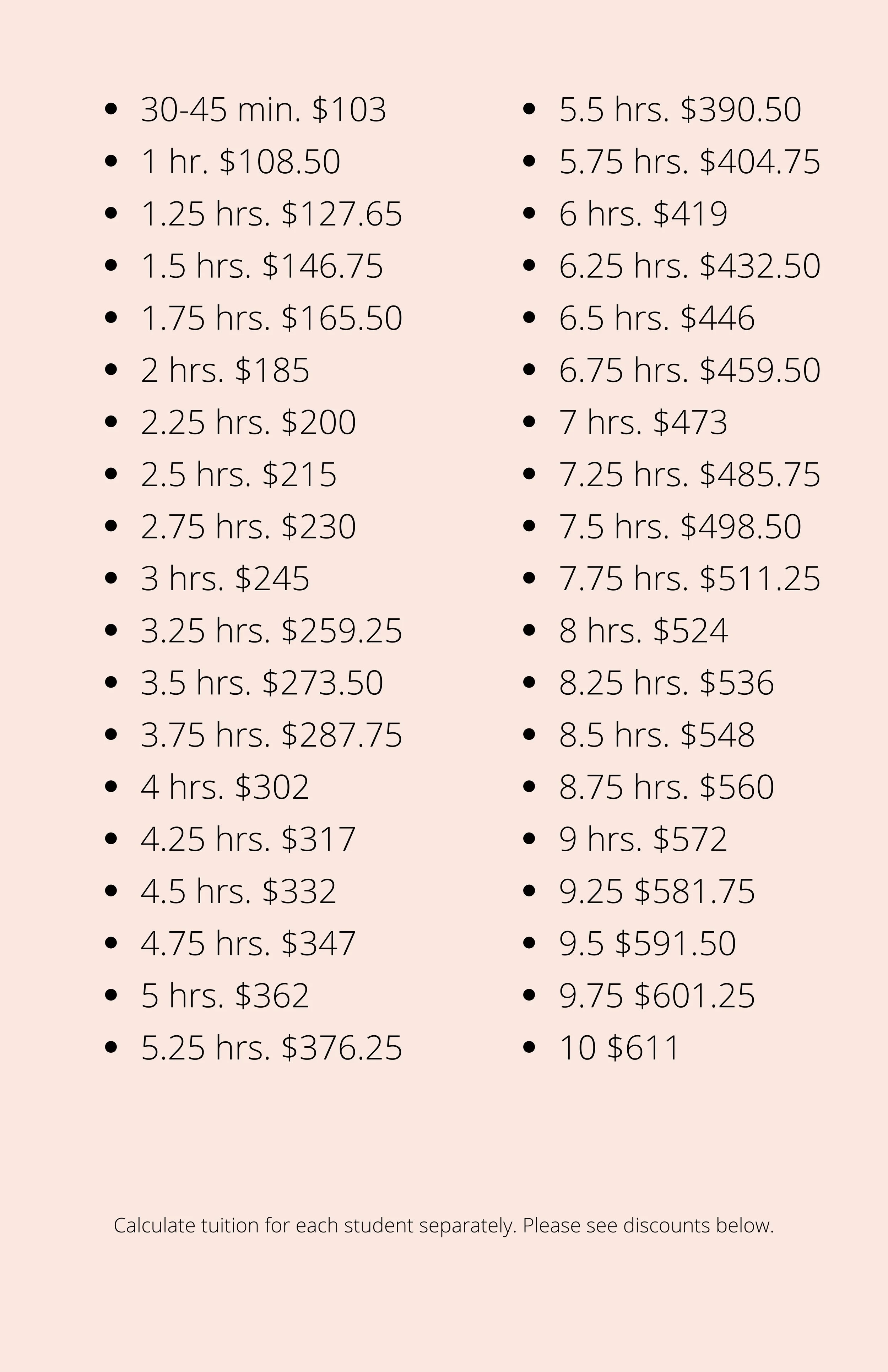 Tuition is time per week=student tuition total for the entire 6 week session. Calculate tuition for each student separately. Please see discounts below (must register before May 10th for discounts).